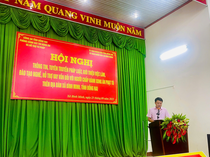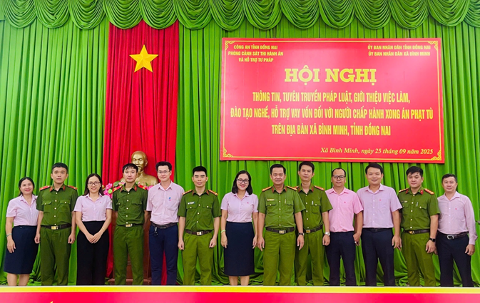 Ngày 25/9, tại trụ sở Trung tâm dịch vụ tổng hợp xã Bình Minh, Phòng Cảnh sát Thi hành án hình sự và Hỗ trợ tư pháp, Công an tỉnh Đồng Nai phối hợp với Chi nhánh Ngân hàng Chính sách xã hội (CSXH) tỉnh Đồng Nai và UBND xã Bình Minh tổ chức Hội nghị thông tin, tuyên truyền pháp luật, giới thiệu việc làm, đào tạo nghề, hỗ trợ vay vốn đối với CHXAPT về cư trú trên địa bàn xã Bình Minh, tỉnh Đồng Nai.