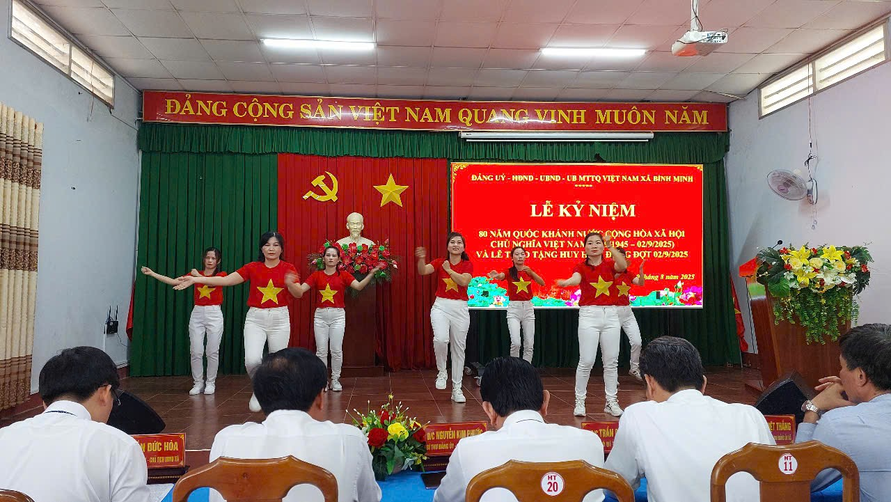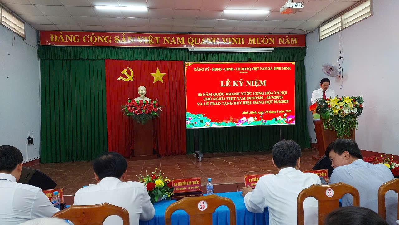 Sáng ngày 29/8/2025, Đảng ủy - HĐND - UBND - Ủy ban MTTQ Việt Nam xã Bình Minh long trọng tổ chức lễ kỷ niệm 80 năm Quốc khánh nước Cộng hòa xã hội chủ nghĩa Việt Nam (02/9/1945 - 02/9/2025) và trao tặng Huy hiệu Đảng đợt 02/9/2025.