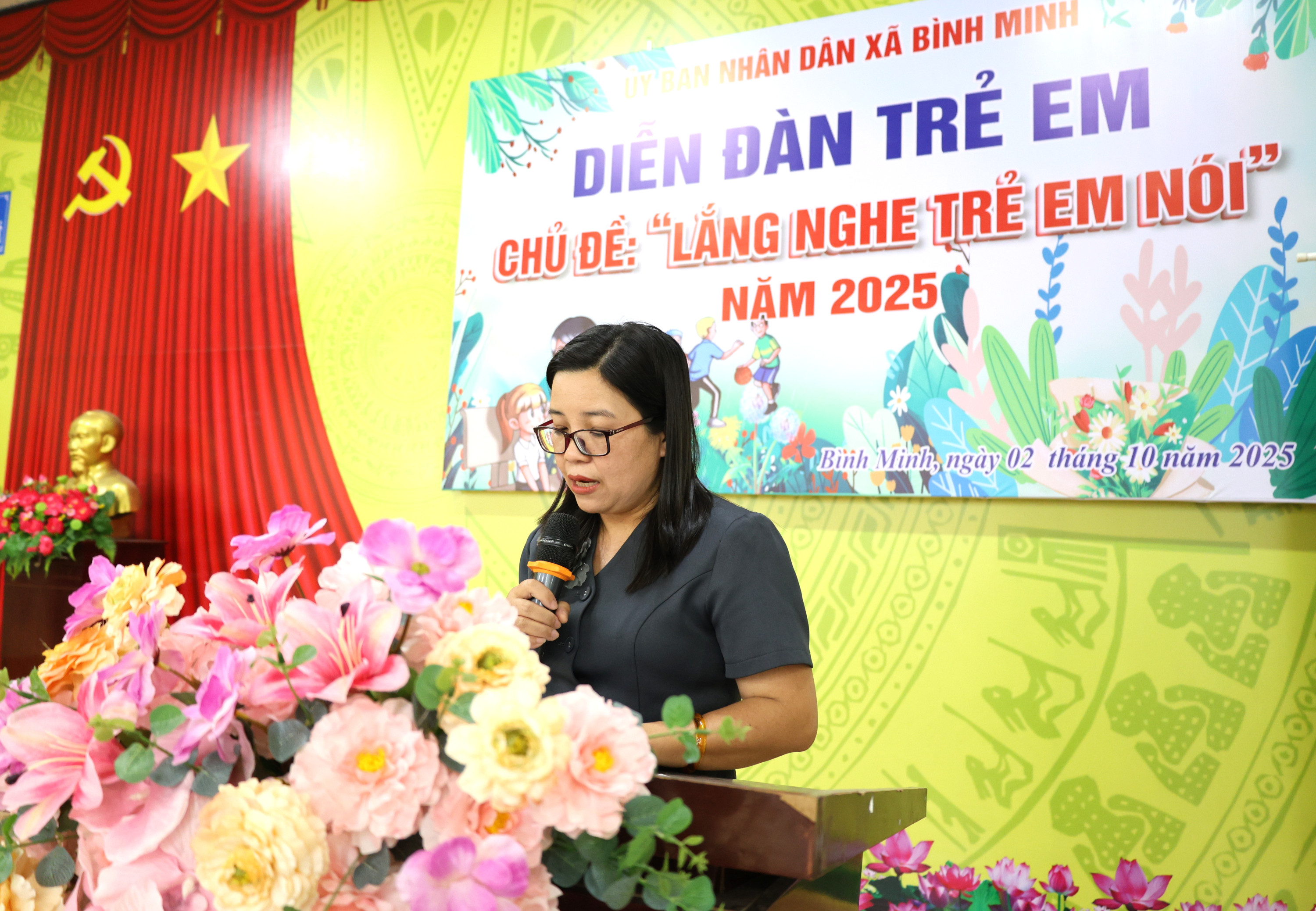 Phát biểu khai mạc tạị Diễn đàn, bà Phạm Thị Lệ Thủy - Uỷ viên BTV Đảng uỷ, Phó Chủ tịch UBND xã, Trưởng ban tổ chức bày tỏ: “Qua diễn đàn, UBND xã mong muốn nhận được các ý kiến phát biểu của các em học sinh về những vấn đề các em quan tâm, gửi đến các cấp ủy Đảng, chính quyền, các ban, ngành, đoàn thể, gia đình, nhà trường, cộng đồng và toàn xã hội hãy xây dựng môi trường an toàn, lành mạnh và thân thiện cho trẻ em; phòng chông xâm hại, ngược đãi và bạo hành trẻ em; tôn trọng, lắng nghe ý kiến và thúc đẩy quyền tham gia của trẻ em. Đồng thời, tiếp tục đẩy mạnh thực hiện các hoạt động trọng tâm của công tác bảo vệ, chăm sóc trẻ em, tạo phong trào mạnh mẽ trong toàn xã hội.
