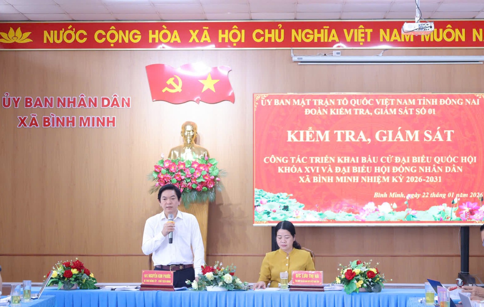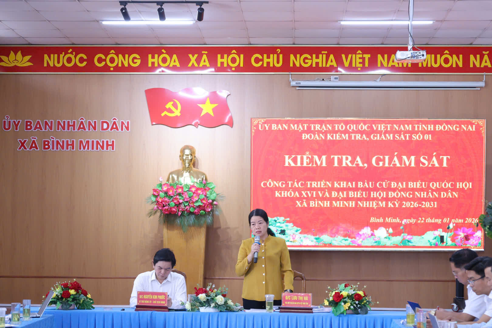 Sáng ngày 22/1/2026, Đoàn kiểm tra, giám sát của Ủy ban MTTQ Việt Nam tỉnh Đồng Nai do đồng chí Lưu Thị Hà - Phó Chủ tịch Ủy ban MTTQ Việt Nam tỉnh làm trưởng đoàn đã làm việc với xã Bình Minh về triển khai công tác bầu cử đại biểu Quốc hội khóa XVI và đại biểu HĐND các cấp, nhiệm kỳ 2026-2031.