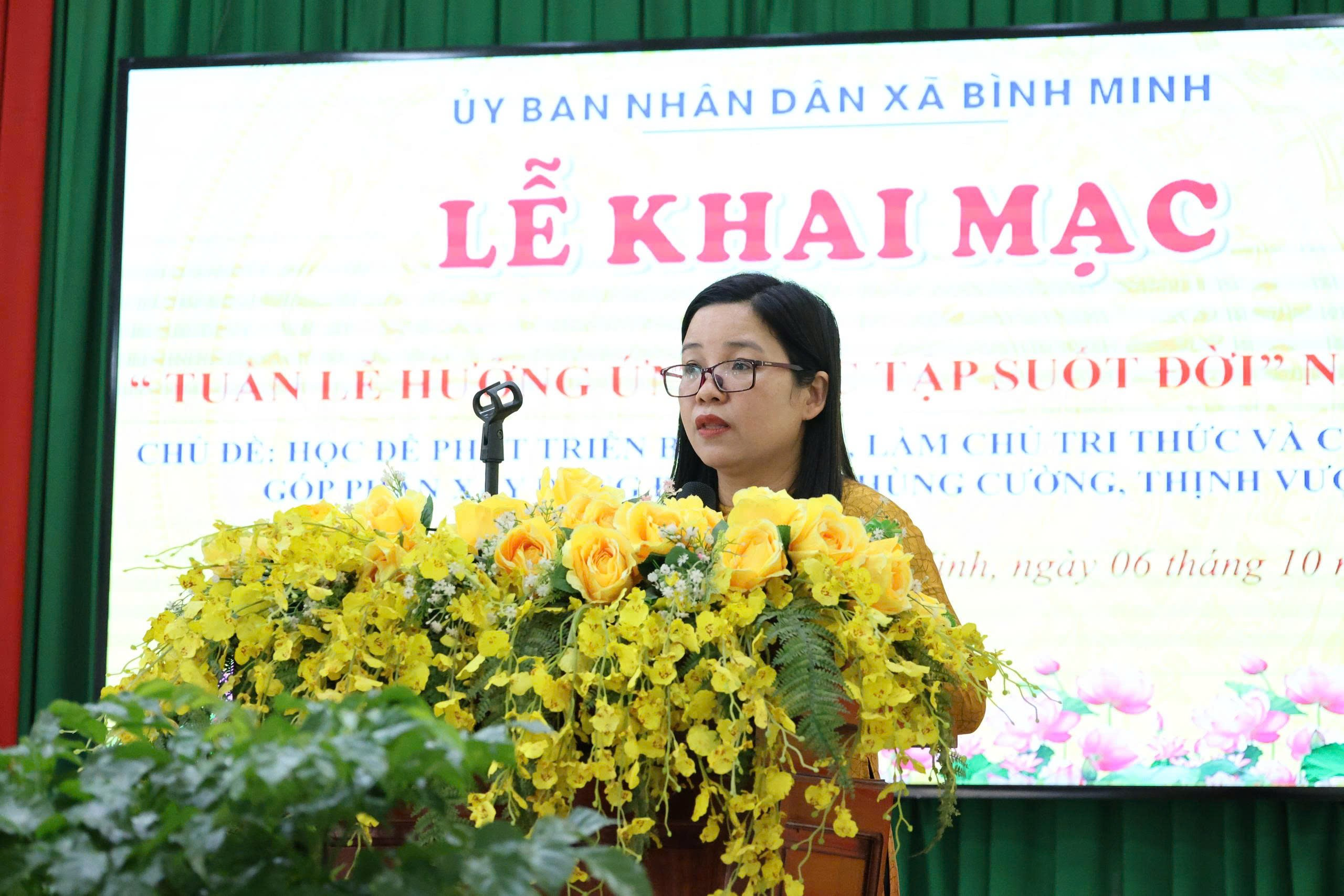 Phát biểu tại buổi lễ, đồng chí Phạm Thị Lệ Thủy, Ủy viên Ban Thường vụ, Phó Chủ tịch UBND xã kêu gọi toàn thể cán bộ, công chức, viên chức, người lao động, các thầy cô giáo, phụ huynh và học sinh tích cực hưởng ứng Tuần lễ; nêu cao tinh thần “Học để biết, học để làm, học để chung sống và học để tự khẳng định mình”, biến việc học thành nhu cầu thường xuyên, nét đẹp trong văn hóa cộng đồng.